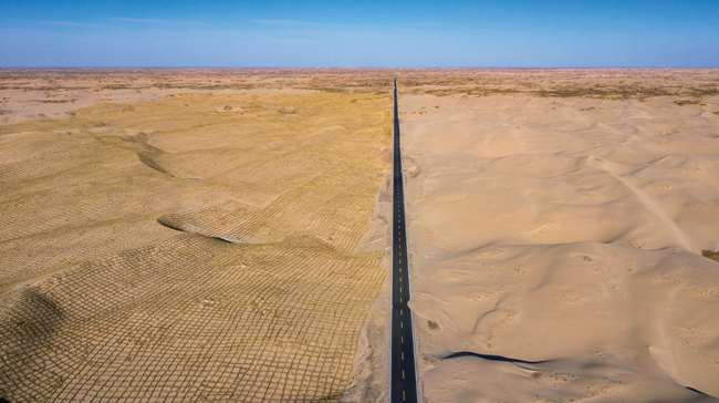 ▲内蒙古赤峰市翁牛特旗乌丹至白音套海生态旅游产业路横穿科尔沁沙漠,是赤峰境内最长的一条穿沙柏油公路。