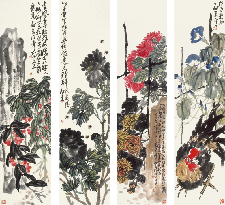 郭石夫早年画人物、画山水,他崇尚梁楷、陈洪绶、任伯年等传统人物画家,也激赏“四僧”“四王”“元四家”等传统山水画家,还曾一度学习“徐蒋体系”,人物画得很严谨、很扎实。而立之年,因受李苦禅、潘天寿等老一代艺术名家的影响,专攻花鸟,又因崇拜齐白石、吴昌硕,而在齐白石、吴昌硕的笔墨里沉浸多年。期间,画过恣肆酣畅的大写意,也画过灵动雅致的小写意,也曾因画得太像齐白石、吴昌硕而受到时人的批评,苦恼过,也困惑过。后来,郭石夫取法乎上,学“扬州八怪”,学陈淳、徐渭、八大,也追根溯源过林良、吕纪、王冕、杨补之、钱选等传统花鸟画家,心追手摹,勤学苦练,下过很大功夫,也打下了坚实的笔墨基础。