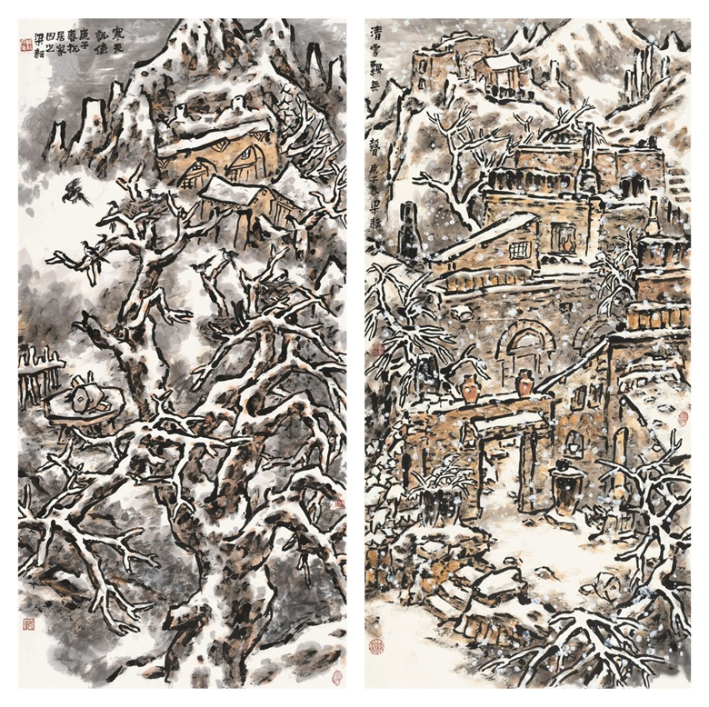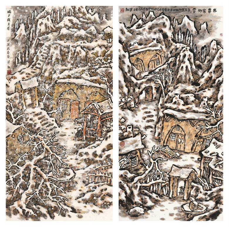 梁耘 《瑞雪故乡情》纸本设色 138cmx69cm 2022年 梁耘 《我喜家乡雪》 纸本设色 138cmx69cm 2020年