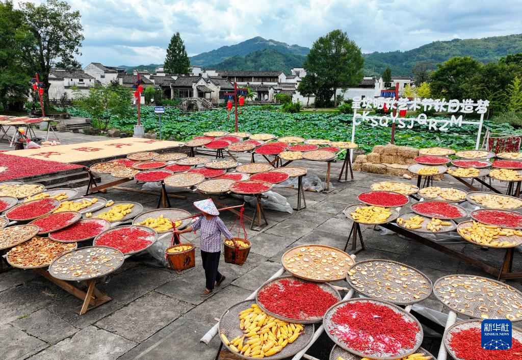 进入秋季,安徽省黄山市徽州区呈坎村村民趁着晴好天气,晾晒玉米、南瓜、红辣椒等农作物,吸引不少游客前往观赏,感受丰收的喜悦。