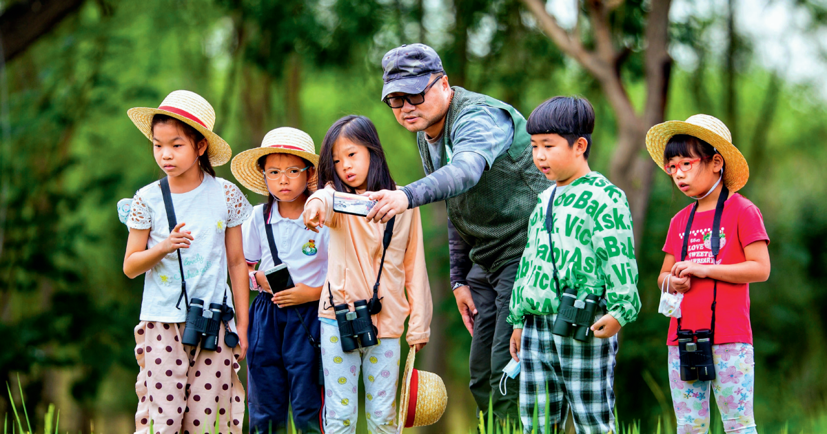 ▲羿健带着孩子们在北京通州大运河畔观鸟。