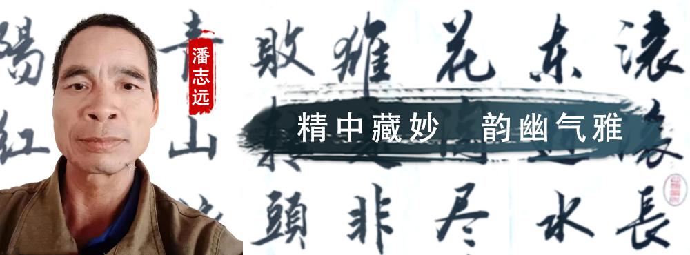 在广西来宾忻城的山水之间,有一位书法艺术家,他的名字叫潘志远。他擅长行书及行草,师柳体法度,习颜体气势,学“二王”笔法,又遍临诸家名帖。他坚持读帖、背帖、析帖、悟帖,在读帖中细察字的点画、结体、篇章布局;于背帖中体会古代书家的用笔、用墨、左右开合、上下呼应;在临帖中明悟用墨的浓淡枯湿;又在悟帖中感悟出古代书法家名作中蕴含的气势、精神和美感。