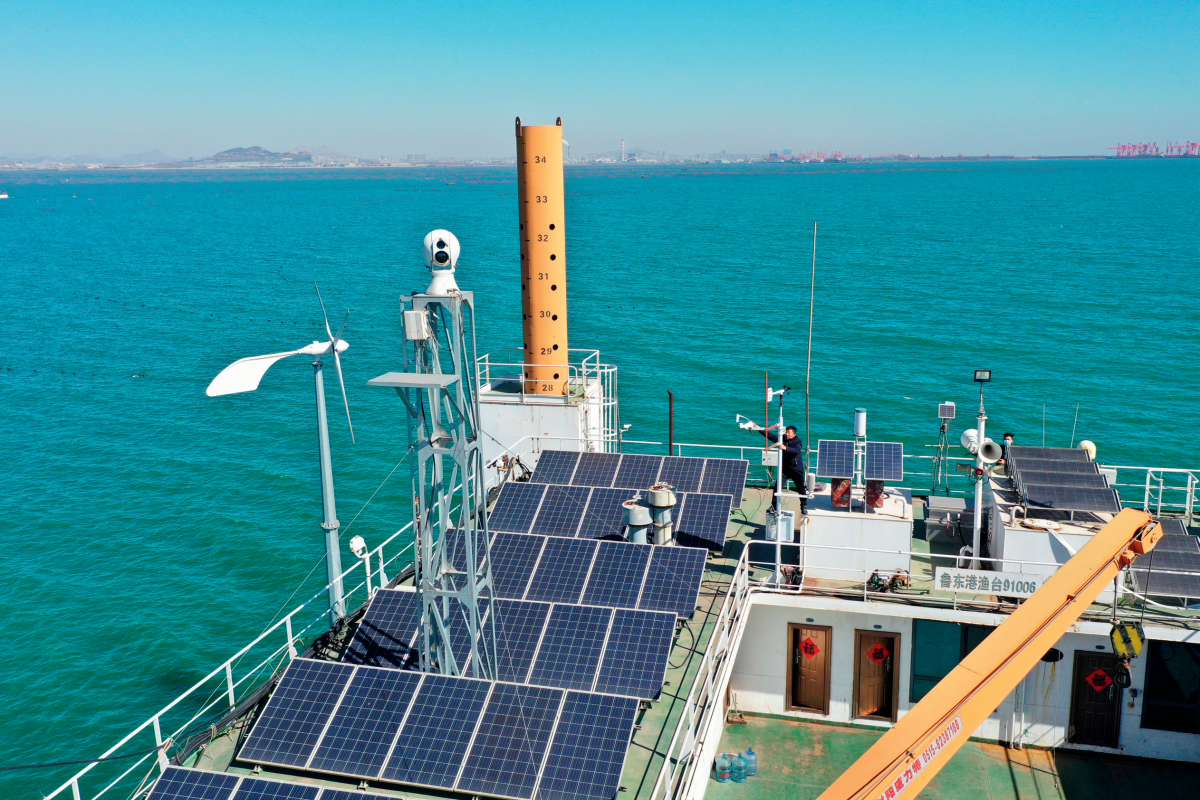 ▲山东省日照市气象局与地方财政、海洋、保险部门联合推出海洋牧场巨灾保险。图为日照市气象局装备保障人员在维护日照水产集团海洋牧场自动气象观测站(图/徐浩然)