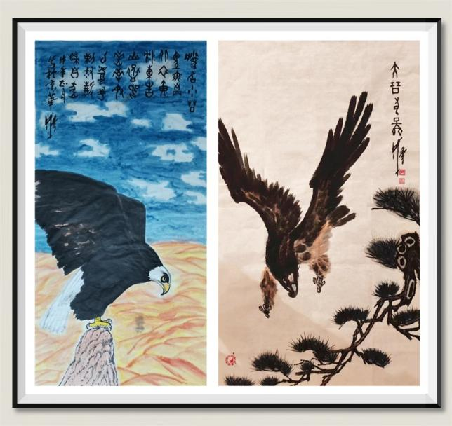 绘画,祝秀成常作山水、龙腾、雄鹰题材,其雄鹰最受瞩目。也许他骨子里镌刻着雄鹰般的品格,那“展翅鼓长风、一举九万里”的气势,那“睥睨天下、俯瞰世界”的胸襟,还有那“上九天揽月,下五洋捉鳖”的壮志……,统合一体,融成精妙。
