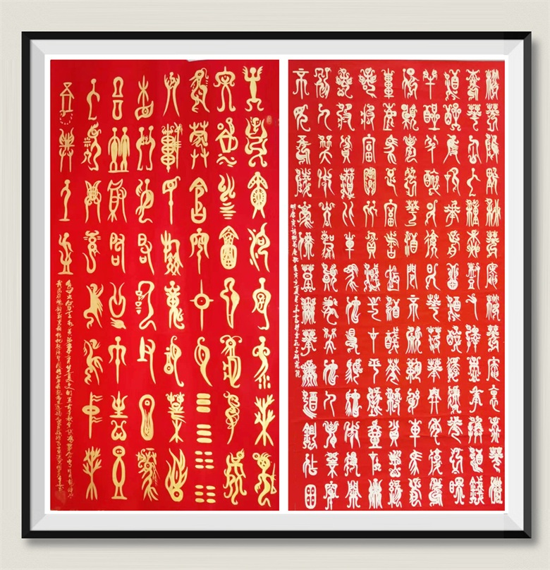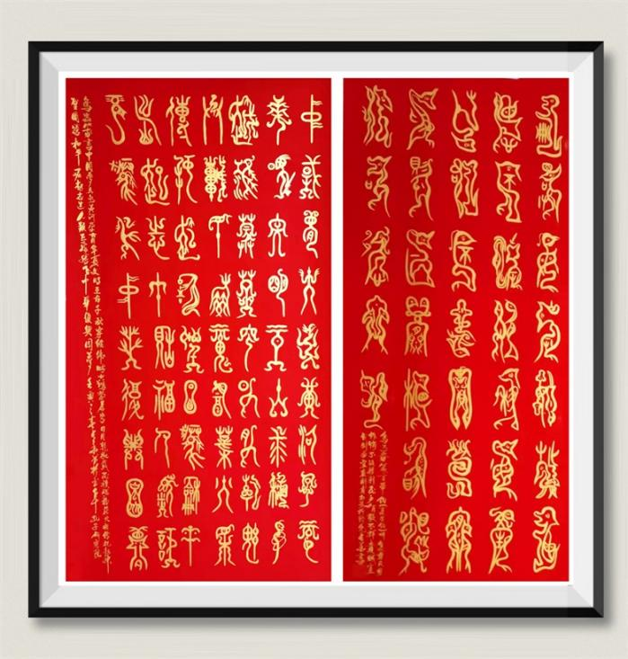 刘长华鸟虫篆书法作品《中国梦》天水黄河孕育华夏文明(左) 《箴言带钩》注释:册复毋反,毋作勿悔,不汲于利,民产有敬,不择贵溅,宜曲则曲,宜植则直,勿可则中,允(右)