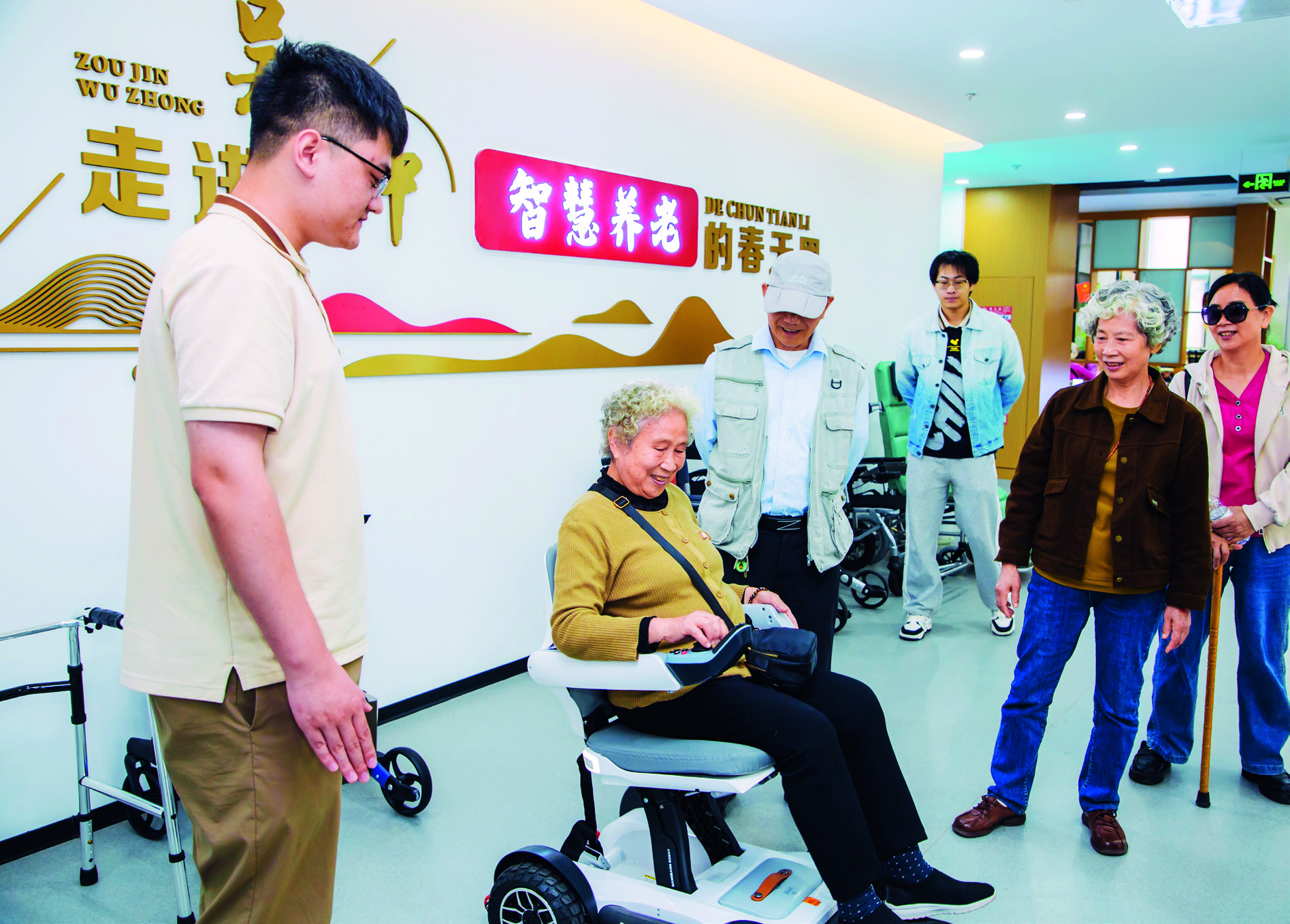 ▲苏州市吴中区举办金秋老博会,老年人在体验电动轮椅。