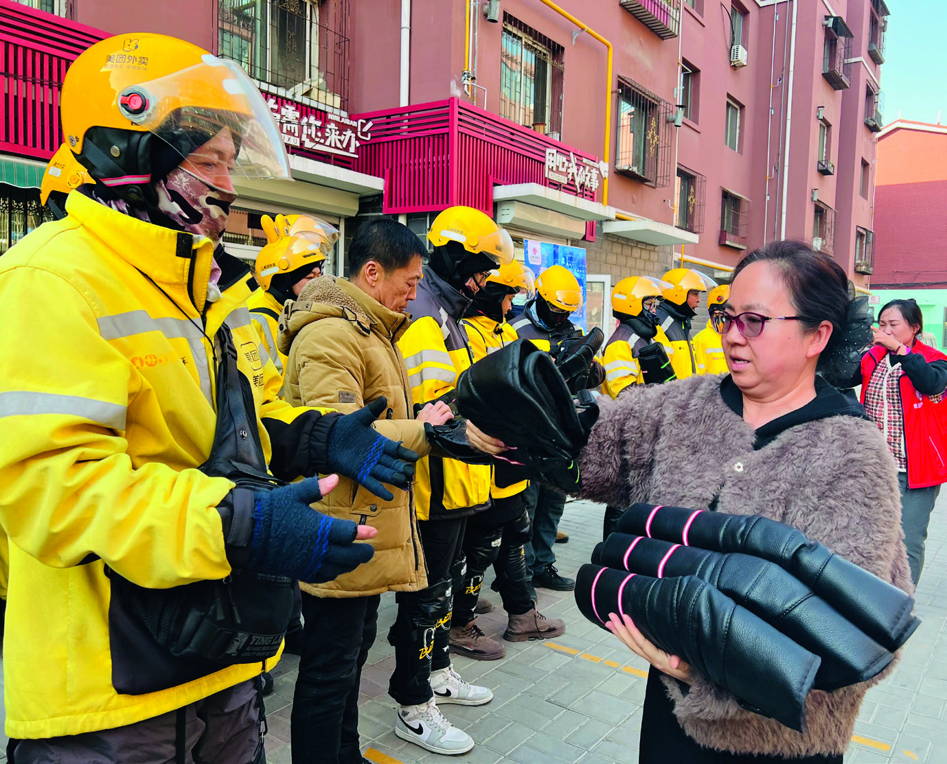 ▲社区工作人员向外卖员发放护膝,为新就业群体送温暖。