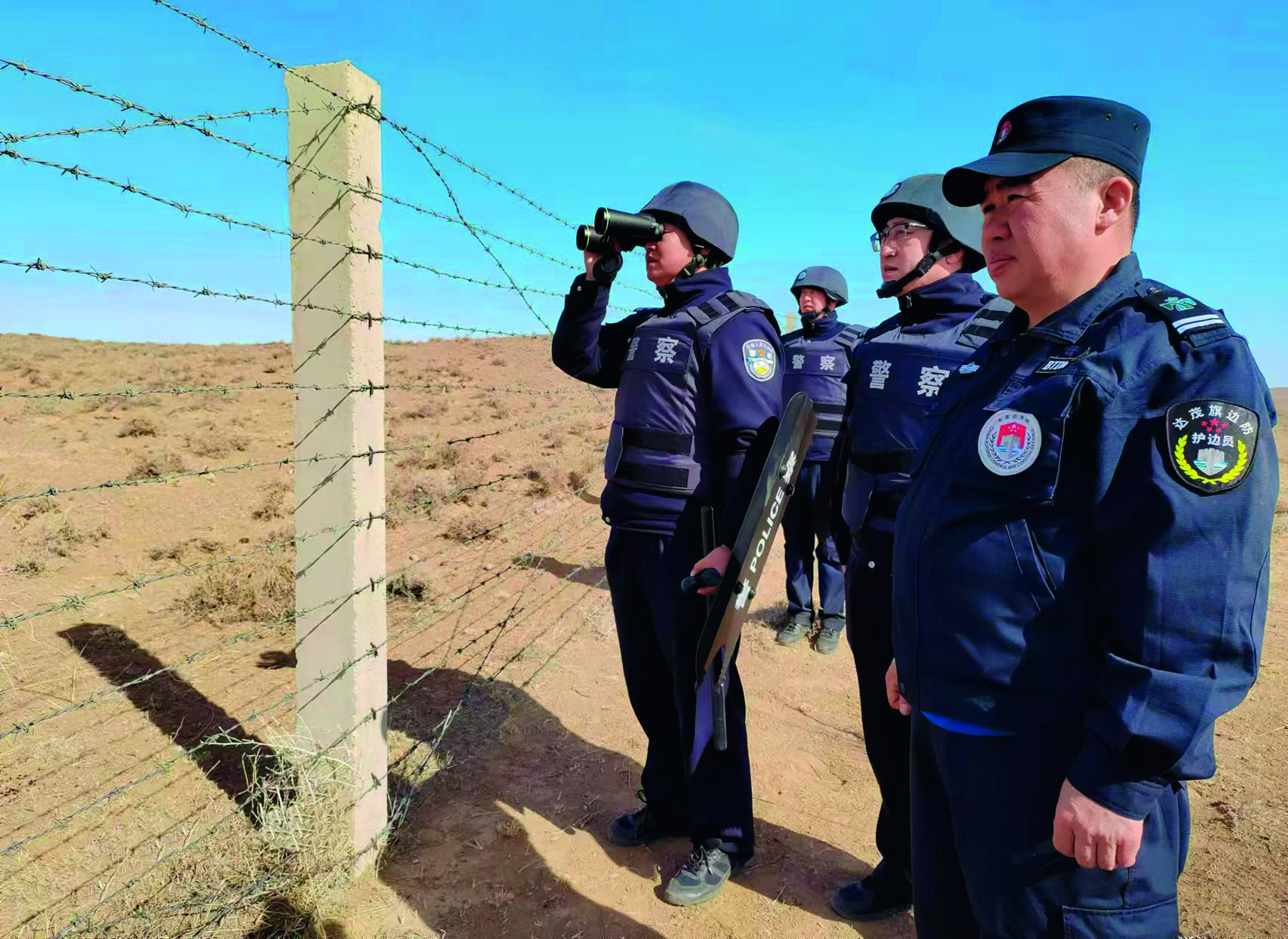 ▲达茂旗红色堡垒户、护边员莎仁图雅(右一)与民警在观察边境线情况。