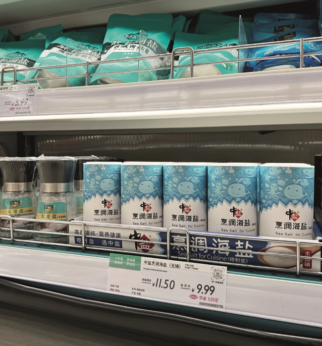 超市货架上摆放着不同用途的食盐。(图/于海军)