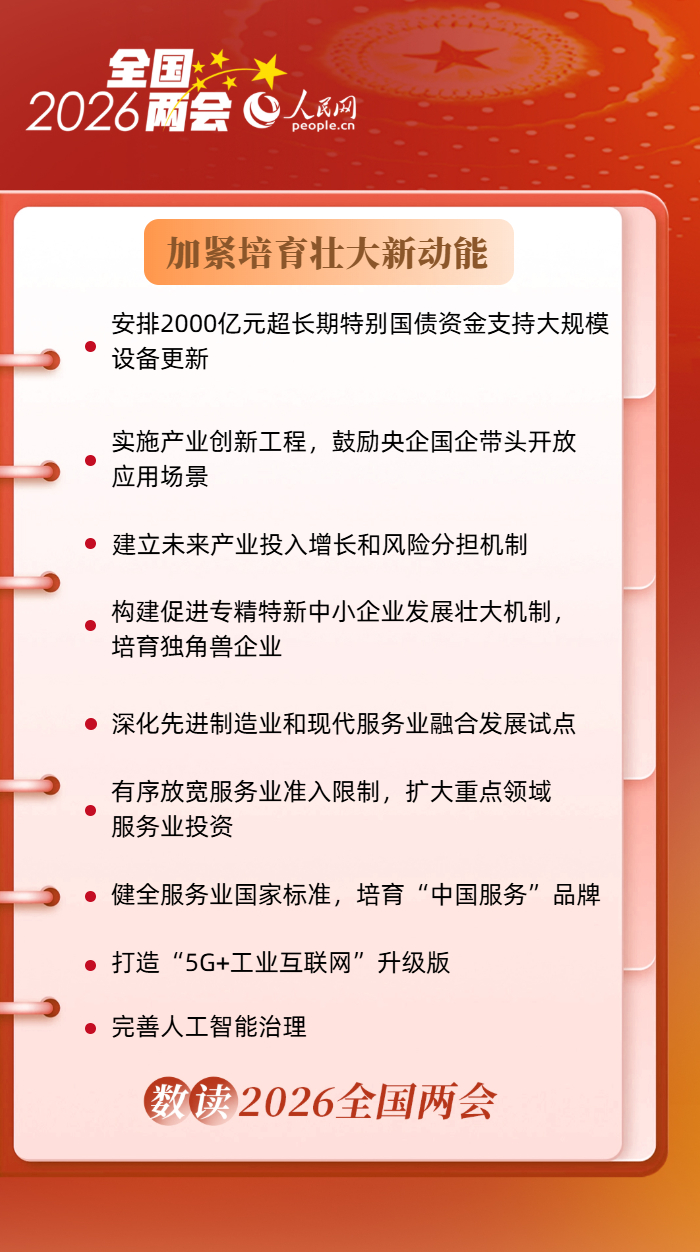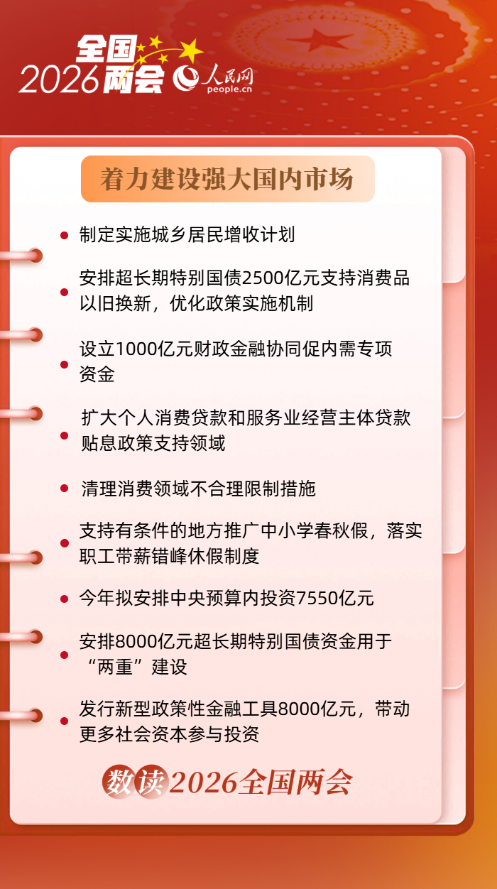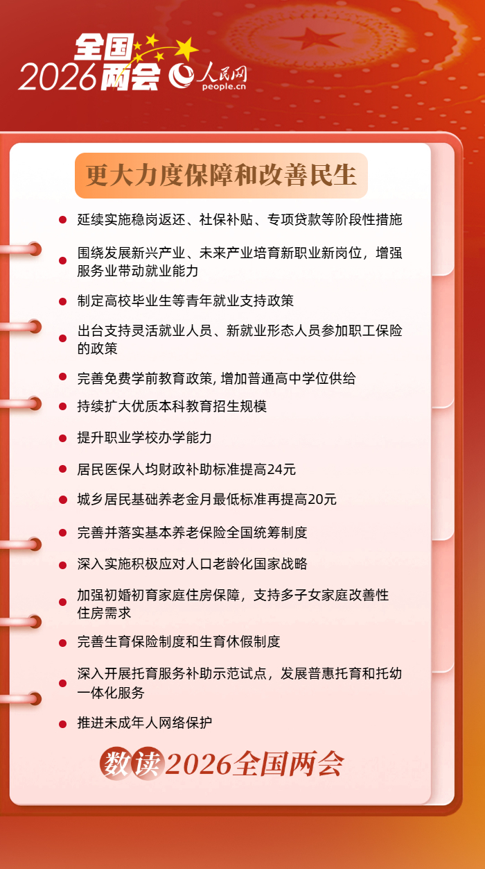 编者按:3月5日,十四届全国人大四次会议在人民大会堂开幕,国务院总理李强作政府工作报告(以下简称报告)。报告指出,着力稳就业、稳企业、稳市场、稳预期,推动经济实现质的有效提升和量的合理增长,保持社会和谐稳定,实现“十五五”良好开局。2026年政府工作中有哪些政策值得关注?一组海报带您速览。