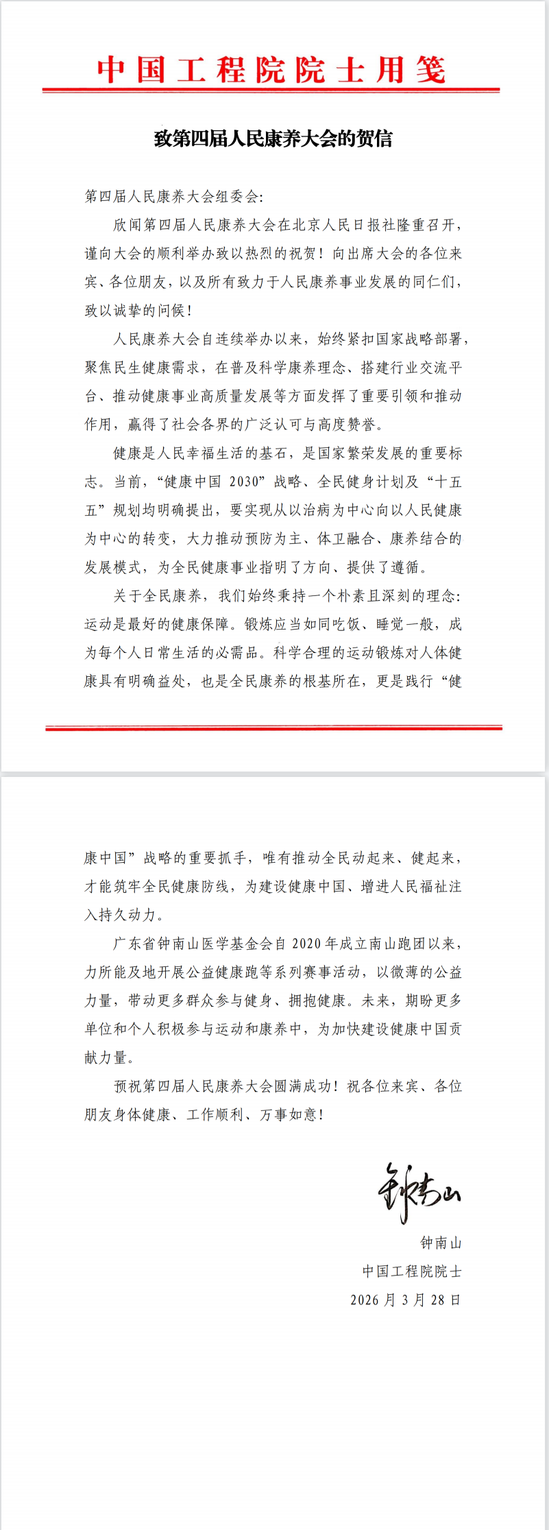 钟南山院士在贺信中预祝第四届人民康养大会圆满成功!祝各位来宾、各位朋友身体健康、工作顺利、万事如意!