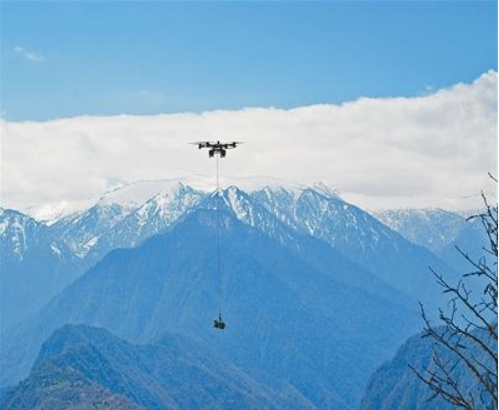 4月10日,藏东南至粤港澳大湾区±800千伏特高压直流输电工程云南段线路首基铁塔基础在云南贡山独龙族怒族自治县开始浇筑,标志着该工程云南段线路正式进入施工阶段。藏粤直流工程是跨越青藏高原、云贵高原和华南丘陵三级地理阶梯的特高压工程,被称为“绿电天路”。图为4月10日,南网超高压公司大理局建设人员在工程现场使用重载无人机开展物料运输工作。