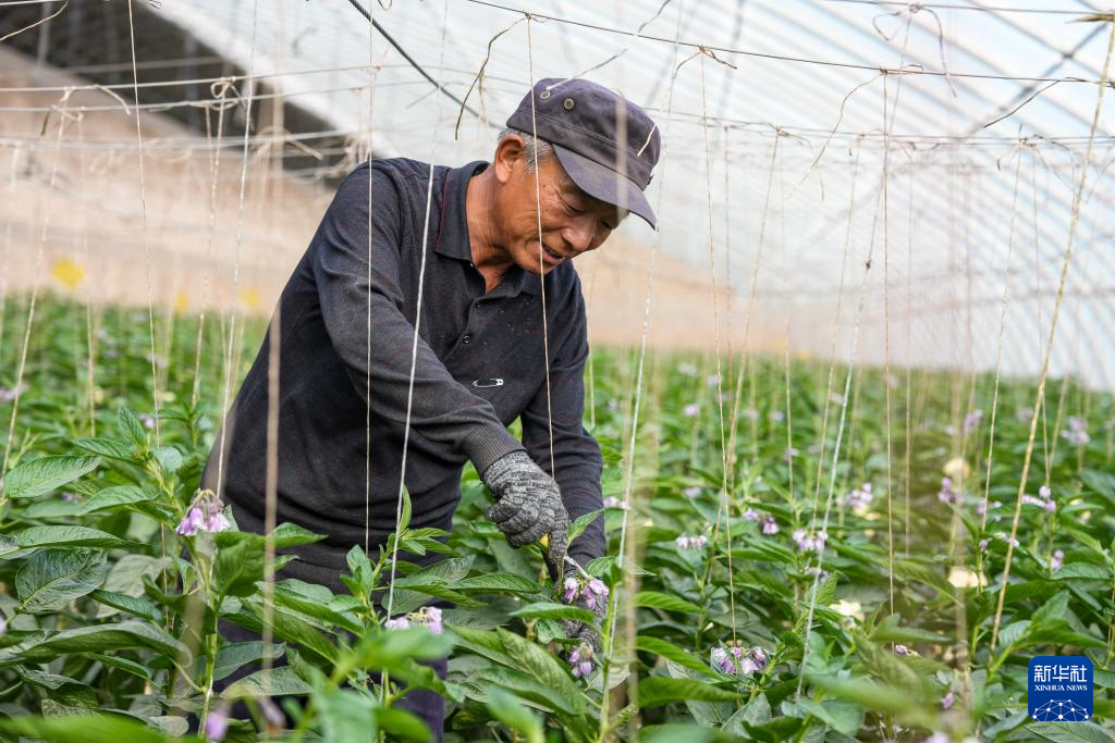 4月23日,在民勤县大滩镇上泉村,村民白生泉在自家温室大棚内进行人参果疏花作业。