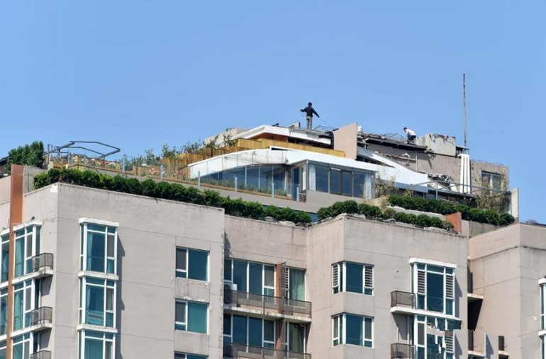 4月22日,曾经引起轰动的北京“最牛违建”人济山庄B座楼顶边缘最近又被种上了灌木。记者在现场看到,B座楼顶东南角被灌木镶了一层“绿边”。同时,楼顶有几名工人正在施工。人济山庄物业工作人员告诉记者,他们对于楼顶发生的一切并不了解。2013年8月,在人济山庄B座楼顶上盘踞了6年的违法建筑“空中别墅”被媒体曝光。违建内有台球厅、KTV房、游泳池,甚至有自带的电梯。要想到达“空中别墅”,只能从住户张必清家内部进入。在被曝光之后,张必清自行拆除了屋顶违建。图为4月22日,北京人济山庄B座的屋顶东南角可见今春新栽种的绿色灌木。