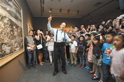 导览现场,有不少小朋友。自称“刘爷爷”的刘墉便亲自讲解一幅幅画作中的玄机。刘墉喜欢像达·芬奇那样在画里面藏东西,类似藏猫头鹰,藏小熊,藏很小很小的字。刘墉将现场的观众带到《明朝有意抱琴来》画作前,得意地说这幅画中就藏了三只维尼小熊。当然为了缩小这一寻宝的难度,刘墉指着画作右上侧那大片树叶,暗示有两只维尼小熊就藏在这里。