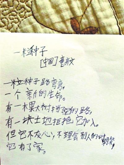 前几天,网友“岁月—好”在微博上发帖说:“9岁的儿子突然写起诗来,不知道这些字怎么钻到他脑子里去的,这算是诗吗?”她附上了儿子写的四首小诗。微博发布后,立即引发大量关注。有网友评论说:“清澈的眼睛看到的世界是最美好的,希望能保持现在文字中那种打动人的稚气和灵气。”