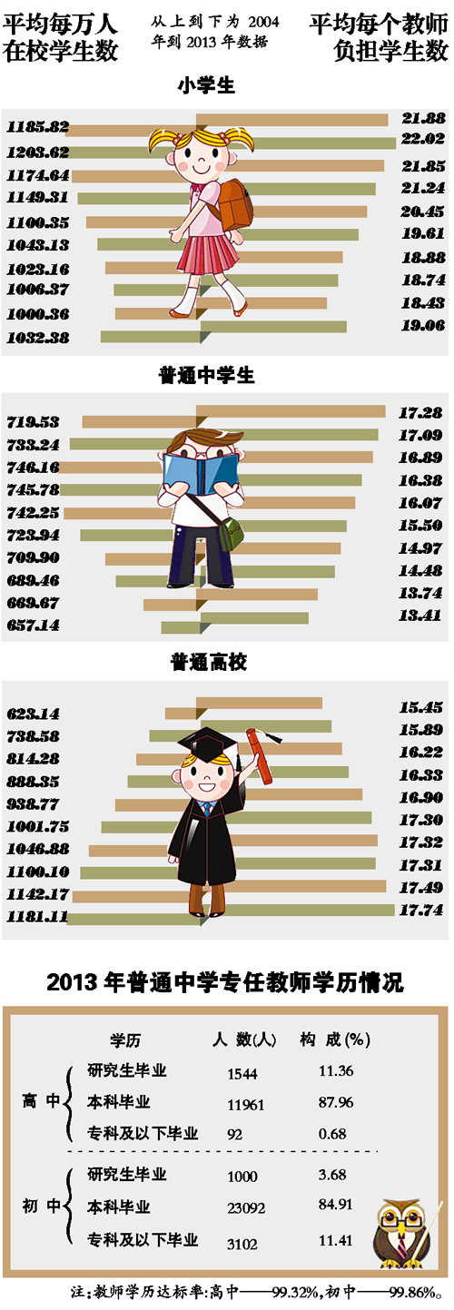 中小学老师的数量在增加,那质量如何?现在很多人都觉得中小学老师是个不错的工作,稳定体面假期又多。每年广州的一些著名中学招聘时,都不乏非师范类的名牌大学生应聘。从业门槛的提高也反映在数据上。1999年,广州的初中老师有59.62%为专科及以下毕业;到了2013年,相应数据仅为11.41%,其他88.59%的初中老师均为本科及以上学历。十多年间中学老师的门槛提升之大,反映了教育资源的优化。