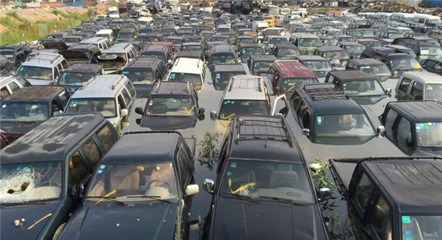 2015年7月19日,浙江义乌,暴雨过后,义乌市江东街道南下朱村某停车场内,废弃车被水淹没。