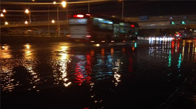 7月22日晚,车辆在北京市石景山区莲芳桥附近冒雨缓慢行进。当晚,北京市部分地区遭遇骤雨袭击。 新华社记者鲁鹏摄