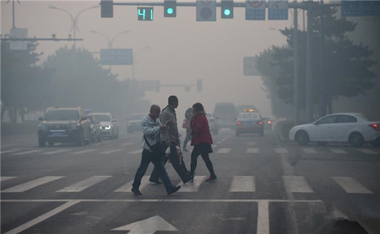 10月25日,路人通过长春一处路口。当日,吉林省出现大范围雾霾天气,空气质量达到中至重度污染。 新华社记者林宏摄