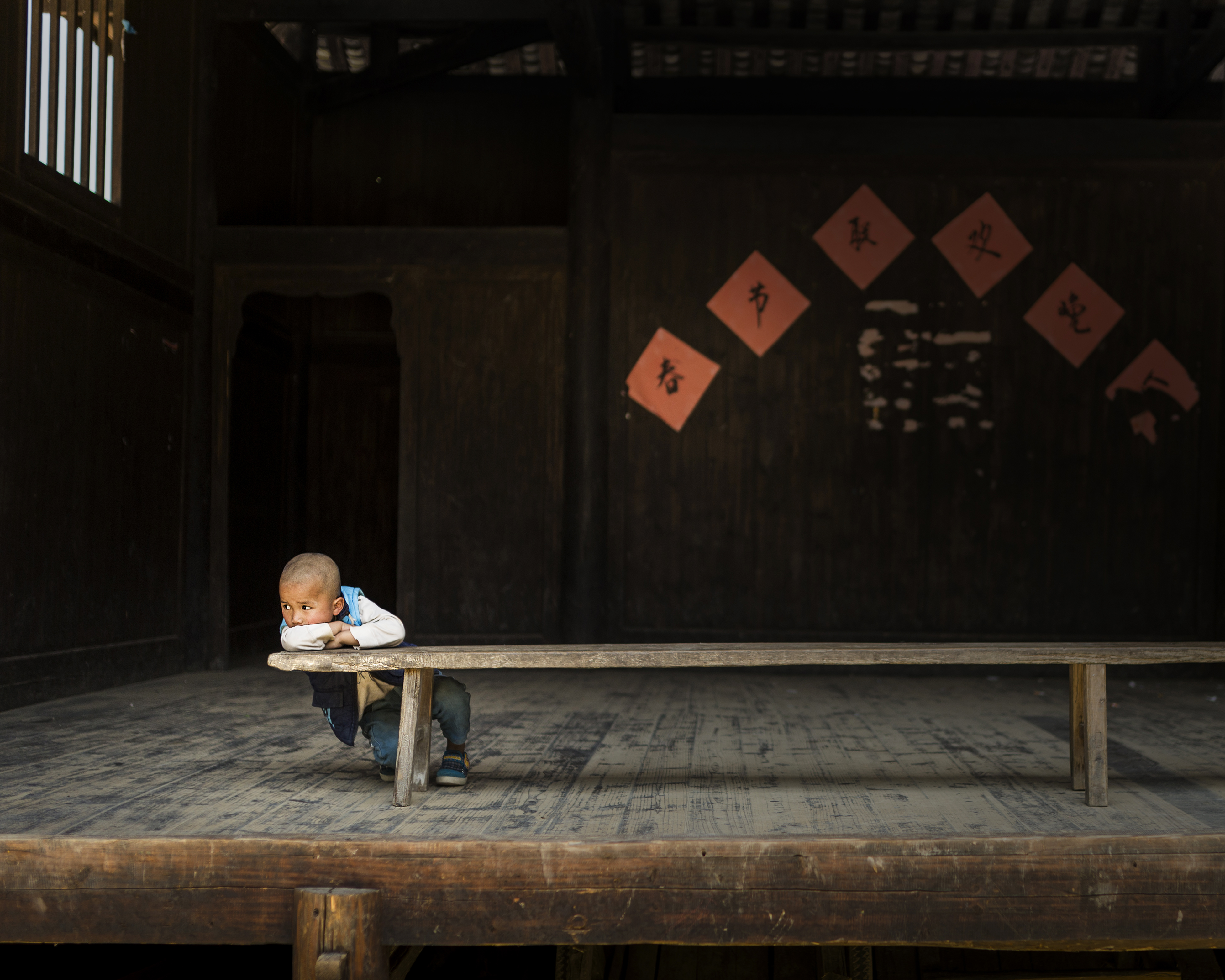 2014年5月1日,湖南通道侗族自治县芋头侗寨。寨子里几乎都是老人妇女和儿童,舞台在侗寨的鼓楼旁。一个七岁的小朋友在舞台边独自玩耍,一会儿坐着。一会儿站着。孩子趴在长凳上,那渴望的眼神,盼望着下一个春节的到来和亲人的团聚。(赵红旗)