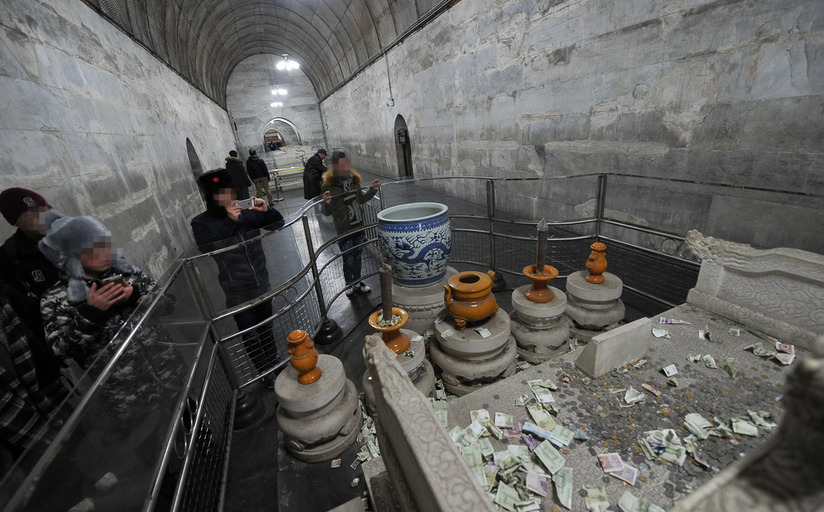 北京明十三陵定陵内遭游客扔钱祈福许愿