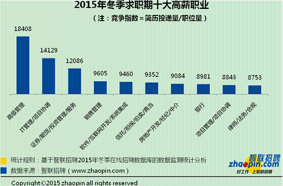2015年冬季求职期薪酬水平排名前十的职业中,高级管理的薪酬高达18408元,其次是IT管理/项目协调,月薪为14129元,再次是证券/期货/投资管理/服务,平均月薪为12086元。高级管理需要多年的工作经验积累,薪酬水平高也比较合理,IT管理/项目协调和证券/期货/投资管理/服务属于高门槛、高要求、高强度、高压力的职业,对应聘者各方面的能力要求非常高,因此这些职位能够获得的较高的薪酬回报。