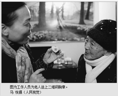 日前,在江西南昌百花洲街道,120名老人每人领到一枚带二维码的胸章,用手机扫一扫,老人所在社区、联系电话及相关病史一目了然。“如果老人不慎走失,好心人扫扫二维码,就能帮助老人顺利回家。”百花洲街道党工委书记付振海说。