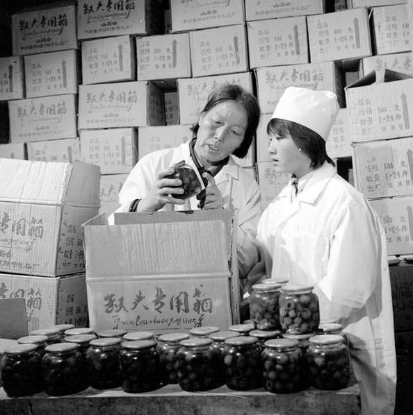 申纪兰带领群众脱贫致富,1986年9月与县供销社联合办起一座罐头厂,投产后的第一个月就生产红果、梨罐头5万多瓶。这是申纪兰(左)和工人一起检查罐头质量。