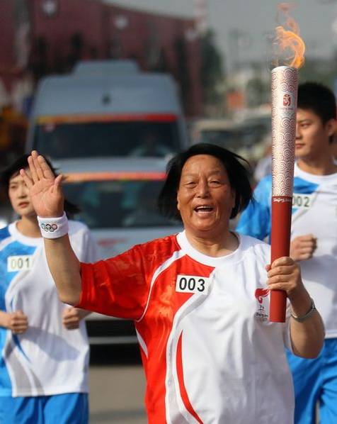 2008年6月26日,奥运火炬手申纪兰手持火炬传递。当日,北京奥运圣火在山西太原传递。新华社记者邢广利摄