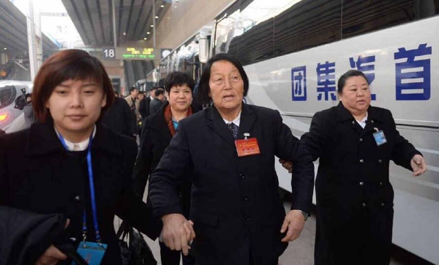 2016年3月2日11点,参加十二届全国人大四次会议的山西代表团乘坐G92次列车抵达北京西站。全国唯一一名连任12届全国人大代表申纪兰随团抵达,出生于1929年的申纪兰今年已是87岁高龄,这是申纪兰第50次出席全国人代会。(北青报摄影记者郝羿)
