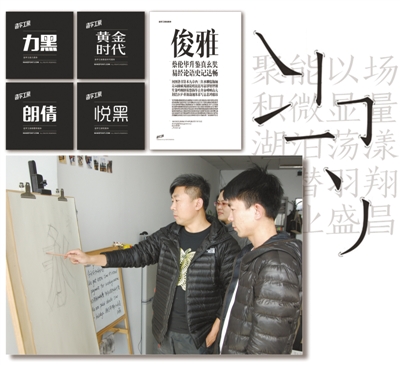 丁一(左一)与同事商量字体设计思路。(记者 卞民德摄 制图:宋嵩)