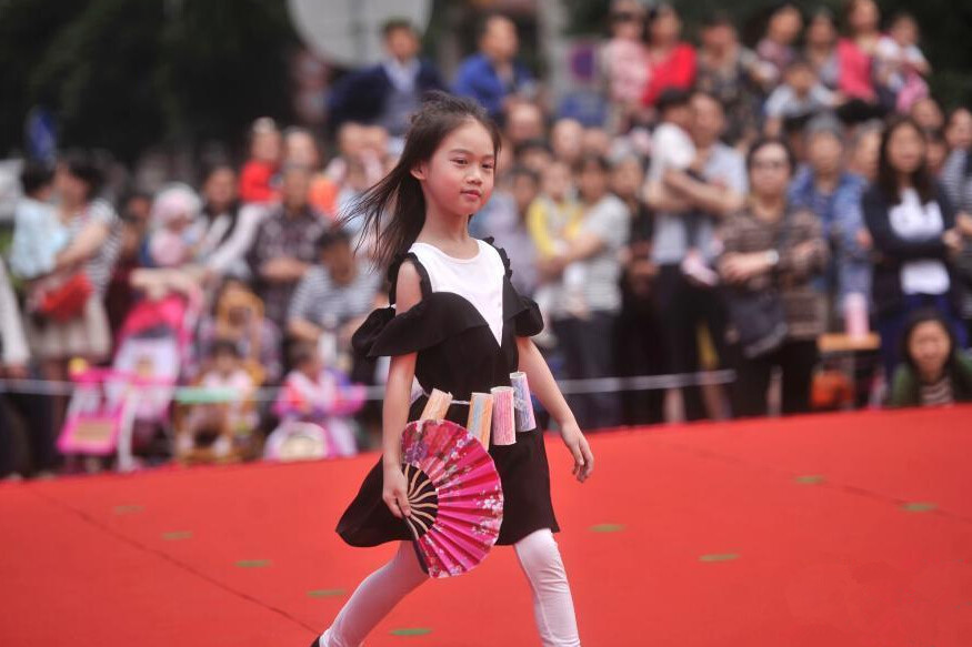 5月30日,重庆沙坪坝土湾街道一幼儿园的10余名小朋友在舞台上走秀,展示利用家庭废品制作的环保时装,庆祝“六一”儿童节的到来。陈超 摄