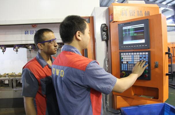 中国员工向乌方员工演示数字车床使用方法。记者谢亚宏 摄