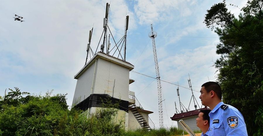 在福建安溪县长坑乡,民警使用无人机对位于深山的电信基站周边进行巡查(9月1日摄)。近日,山东、广东发生3起学生遭遇电信诈骗案件,导致受害者猝死或自杀,引发社会广泛关注。公安部9月9日公布3起案件案情,其中多名犯罪嫌疑人来自福建安溪,包括徐玉玉案的3名犯罪嫌疑人,宋振宁案的主要犯罪嫌疑人上官某等。公安部相关负责人表示,要坚决拔掉一批地域性职业电信诈骗犯罪的“钉子”,坚决扭转重点地区输出犯罪危害全国的状况。(新华社记者魏培全摄)