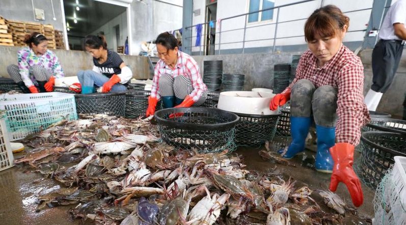 近日,江苏省连云港市海州湾渔场秋捕梭子蟹产量喜人,平均每天抵达沿海各地渔港梭子蟹30多万公斤,除供应本地市场的外,大量梭子蟹通过公路、航空运输到外地市场,为即将到来的中秋节提供充足的市场供应。(王健民摄/光明图片)