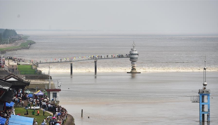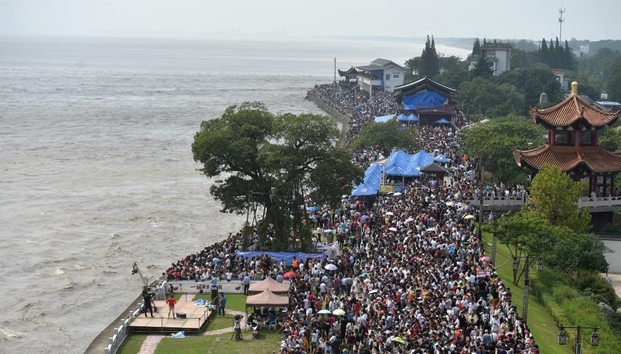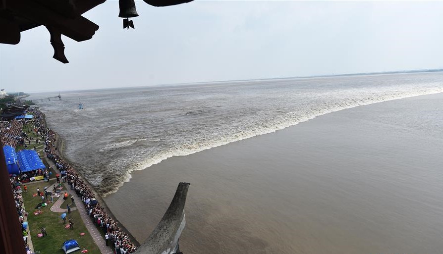 在浙江海宁市盐官镇占鳌塔上拍摄的钱塘江“一线潮”(9月18日摄)。 9月18日是农历八月十八,号称“天下第一潮”的钱塘江大潮汹涌而来。“八月十八潮,壮观天下无”,钱塘江沿岸数十万居民和游客争睹其壮观景象。(新华社记者黄宗治摄)