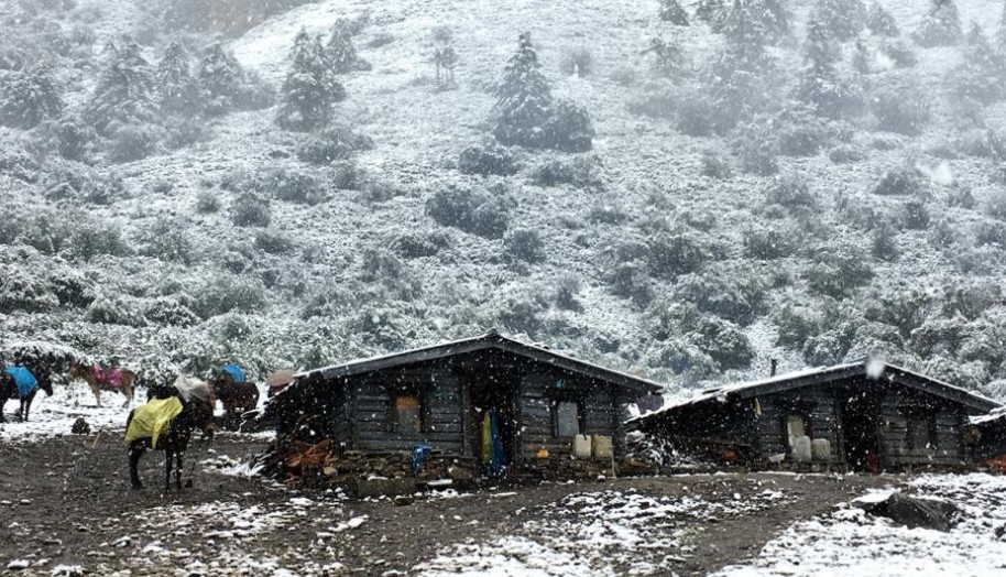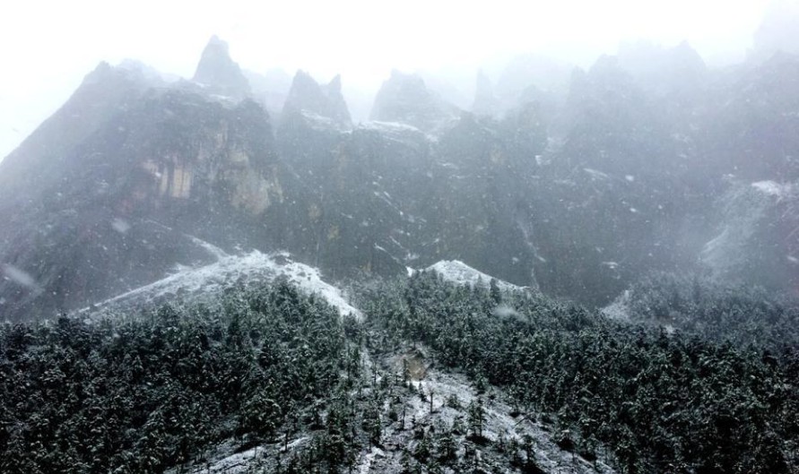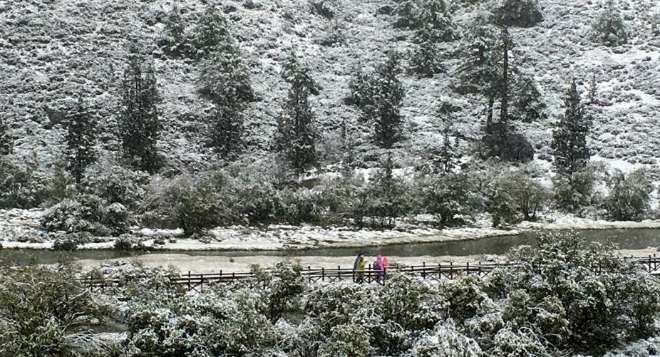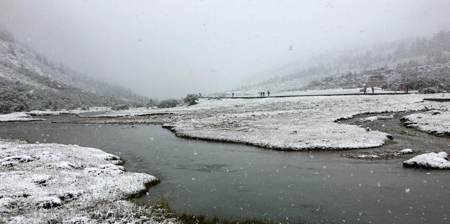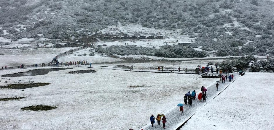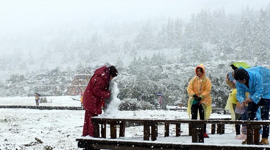 9月20日,受冷空气影响,四川甘孜州稻城亚丁景区雪花飘舞,大雾弥漫,山峰披上白纱,银装素裹。正在景区内游玩的海内外游客纷纷用手机记录雪景,并拍照留念。 (钟欣 摄)