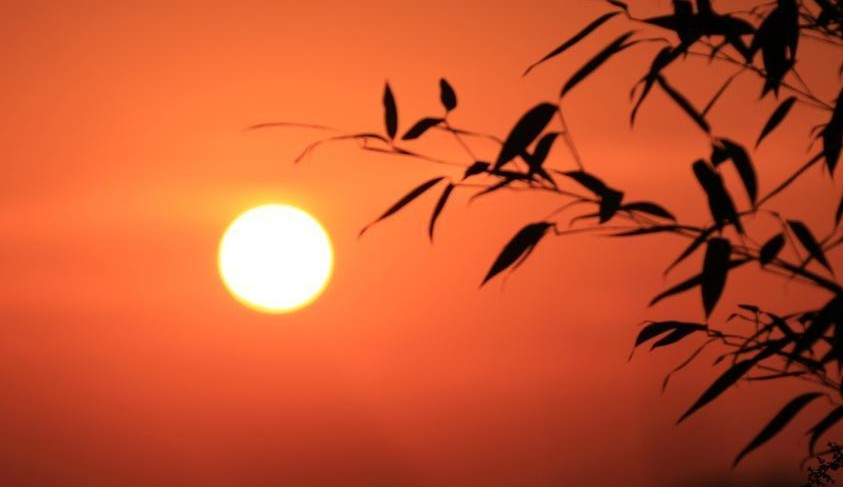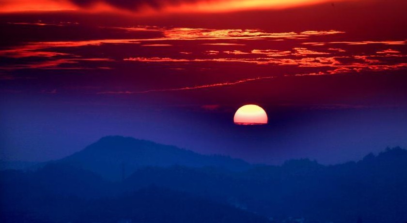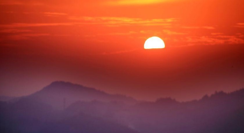 9月21日清晨,在安徽黄山市休宁的天空上, 一轮红日从东方远处的山脉上冉冉升起,通红的朝霞映射在东边的天空,天幕酷似一幅绚烂的油画,其场面罕见壮观。(施广德/人民图片)