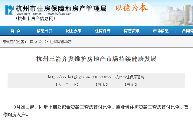 昨日晚间,杭州市住房保障和房产管理局出台新政,自9月28日起,杭州将同步上调公积金贷款二套房首付比例、商业性住房贷款二套房首付比例、暂停购房入户。根据公告,二套房公积金贷款和商业贷款的首付比例将不低于50%。
