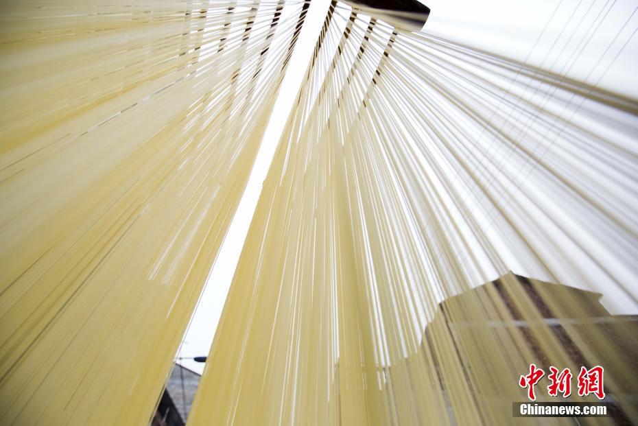 随着新年临近,12月10日,在江西金溪县浒湾古镇,油面师傅们都在忙着制做、晾晒油面。浒湾油面是金溪县的传统手工艺产品,明末见于市场,清代被选为宫廷食品,故有“龙须贡面”之称,已入选省级非物质文化遗产名录。纯手工精制的浒湾油面受到越来越多消费者青睐,俏销四川、江苏等全国各地。如今,仅浒湾街上生产油面的作坊已达18家,年产量达600多吨。傅建斌 摄