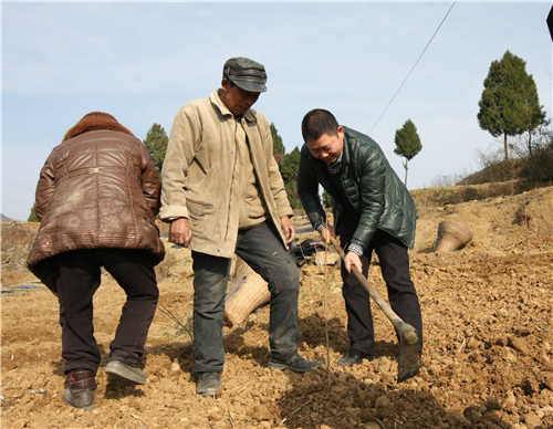 △新山村第一书记杨奇国与村民一起种果苗。图/张超