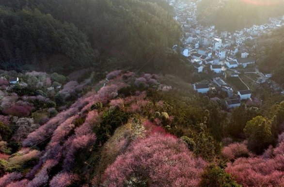 近日,安徽歙县雄村乡洪岭村梅花盛开,房前屋后、山坡谷底,一片姹紫嫣红。洪岭村种花历史悠久,因村形如鱼,世代育花卖花,被称为“卖花渔村”。