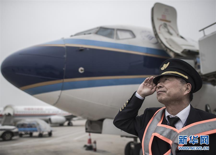 △2月20日,于振华在飞机前。当日,南航湖北分公司功勋飞行员于振华机长来到湖北武汉天河机场,开展安全运行值班工作,5天前他刚刚执行完40年飞行生涯的最后一趟航班。新华社记者 肖艺九 摄