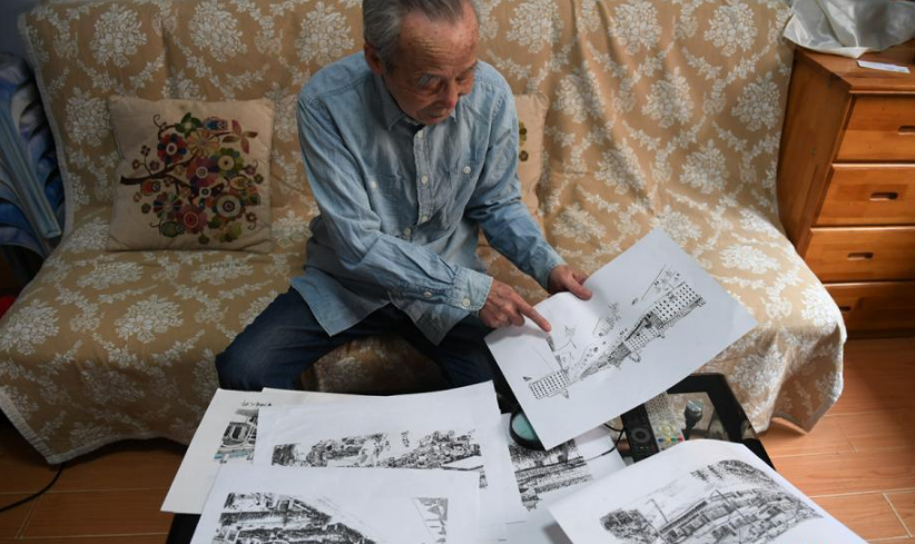 长春市民刘泽贤今年78岁,搞机械设计出身的他一直对老建筑情有独钟。为让后人能了解长春历史,他用黑白线条勾勒出了“伪满八大部”、孝子坟、伪满皇宫等长春百余年间的建筑和街景。 张瑶 摄