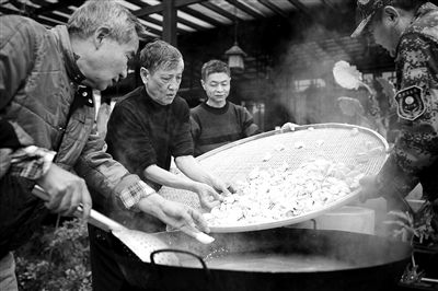 3月26日,老兵服务队就组织了一场饺子宴。当天上午,在小镇文化广场上,围着两口大锅和三张桌案,四、五十名老兵及家属一起揉面、包饺子、煮饺子,好不热闹。