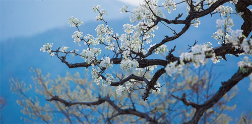 雪白的梨花压满枝头。单独的一颗开在山坡上,觉得它即出众又孤独。