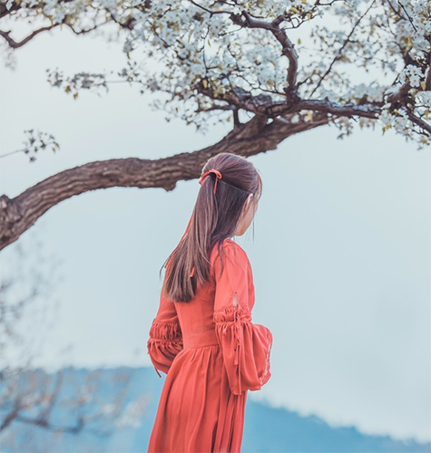洁白的梨花簇拥绽放在枝头,娇嫩的绿叶更衬托它的无瑕。我的红裙子终于上场了。