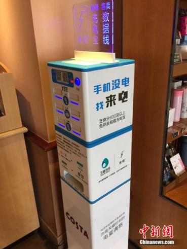 在北京阜成门附近的一家咖啡馆,进门后,映入眼帘的就是一台共享充电宝机柜。中新网记者试着租用了一个充电宝,交押金、扫描机柜上的二维码后,充电宝就从机柜中弹出;使用完毕后,在充电宝机柜点击“归还”的按钮,将充电宝放入充电宝机柜即可。价格1小时1元,租、还流程流畅。
