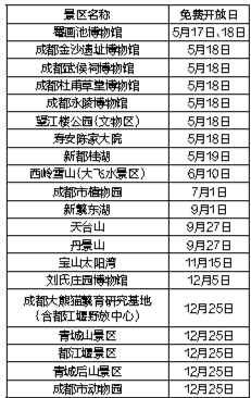 此次公布的20个景点“免费开放日”主要集中在5月17日~12月25日。其中,5月集中了8个景区免费开放日,杜甫草堂、武侯祠、金沙遗址等均在其中。都江堰、青城山、成都大熊猫繁育研究基地、成都动物园等成都人熟悉、外地人慕名已久的景点免费开放日则集中在12月。